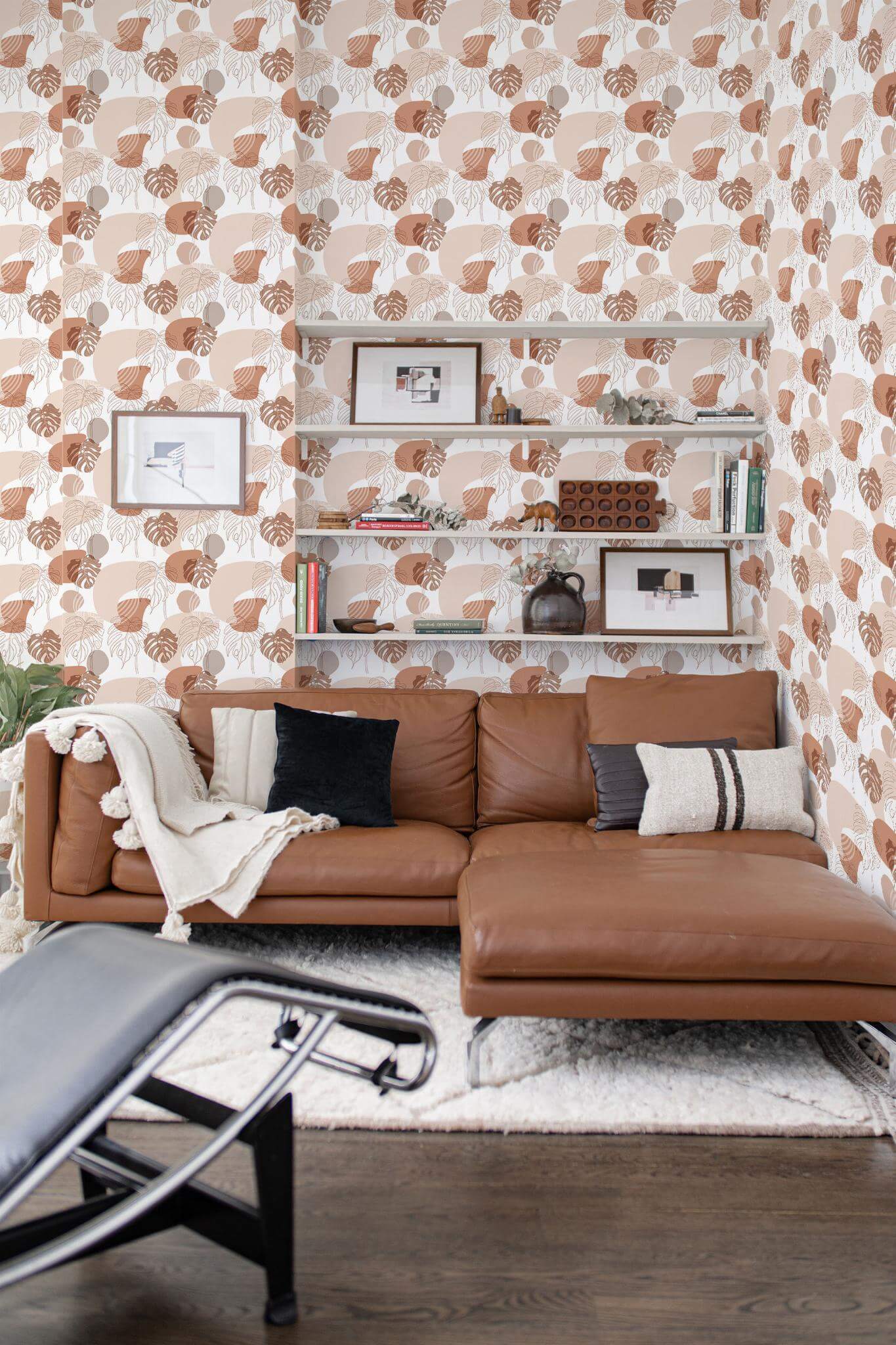 Abstract boho leaf wallpaper brings a touch of tropical elegance to your living room with its soothing beige and brown palette. Delicate monstera leaf outlines dance over abstract organic shapes, creating a serene and earthy composition that effortlessly enhances any interior space. Whether you’re looking to infuse calm and nature into your living room or add a modern, organic touch to another area, Abstract boho leaf wallpaper is your perfect choice. Available in both peel and stick (self-adhesive – no glue needed, removable) and traditional non-pasted options, this wallpaper offers flexibility for your decorating needs. The peel and stick version is particularly easy to apply, allowing you to transform a room with minimal effort. Embrace the joy of bringing a natural, serene vibe to your home with the innovative and eco-friendly design of Abstract boho leaf.