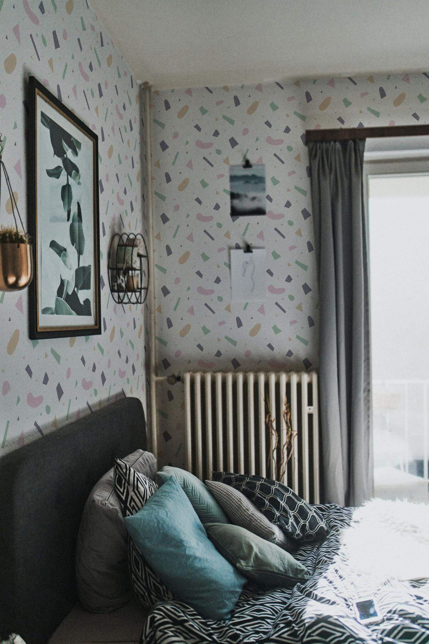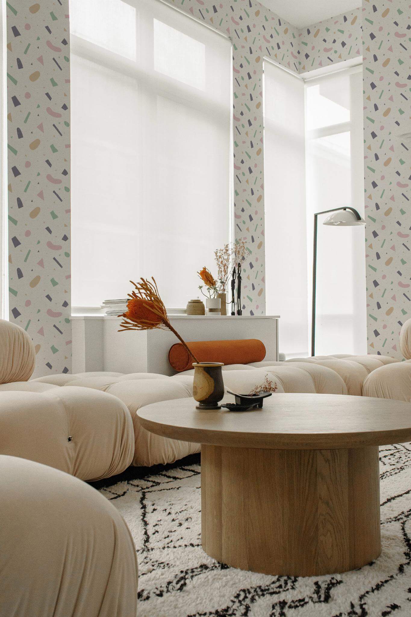 Aesthetic pastel terrazzo wallpaper brings a modern flair to your office with its playful geometric pattern, highlighted by pastel hues and mint green accents on a soft cream backdrop. This whimsical design effortlessly adds a cheerful touch to any room, making it a perfect choice not only for your workspace but also for living rooms or creative studios. The Aesthetic pastel terrazzo wallpaper is available in two options: the peel and stick version, which is self-adhesive and removable, making it easy to apply without any glue, and the non-pasted version, which requires traditional application with glue. Embrace the joy of transforming your interiors with this lighthearted and fun design, crafted by our passionate team to bring color and life into homes around the world, all while ensuring a safe, PVC-free environment.