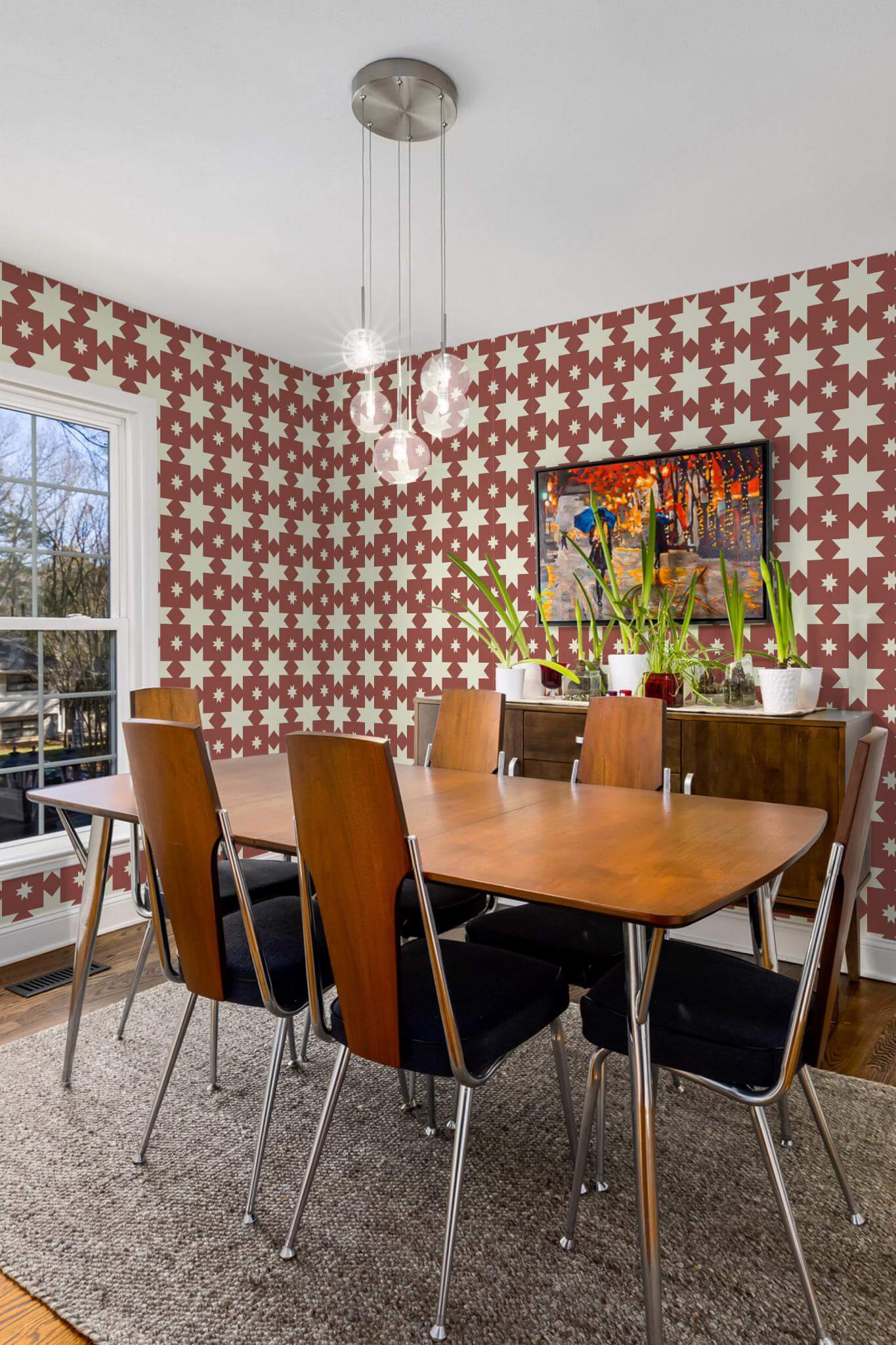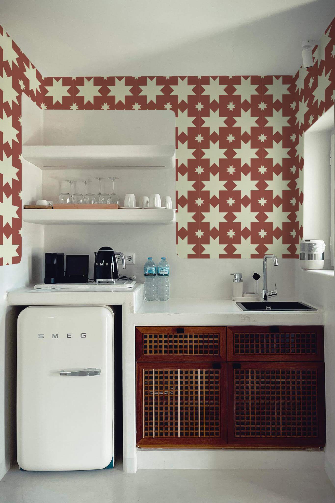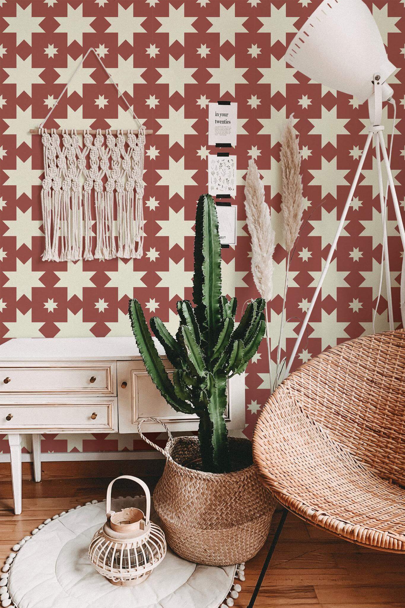 Aesthetic stars wallpaper is a bold and dynamic choice, featuring terracotta geometric stars radiating across a soothing beige backdrop, perfect for adding a modern and retro flair to your kitchen. This striking celestial pattern creates a dramatic contrast that enhances any space, making a graphic statement that can transform not just kitchens, but also dining areas, living rooms, or home offices. The Aesthetic stars wallpaper comes in two options: the easy-to-apply peel and stick version, which is self-adhesive and removable, and the traditional non-pasted type for those who prefer a classic application method. Let your walls shine with this innovative design, crafted by our passionate and global team dedicated to bringing joy and color into homes with safe, PVC-free wall décor.