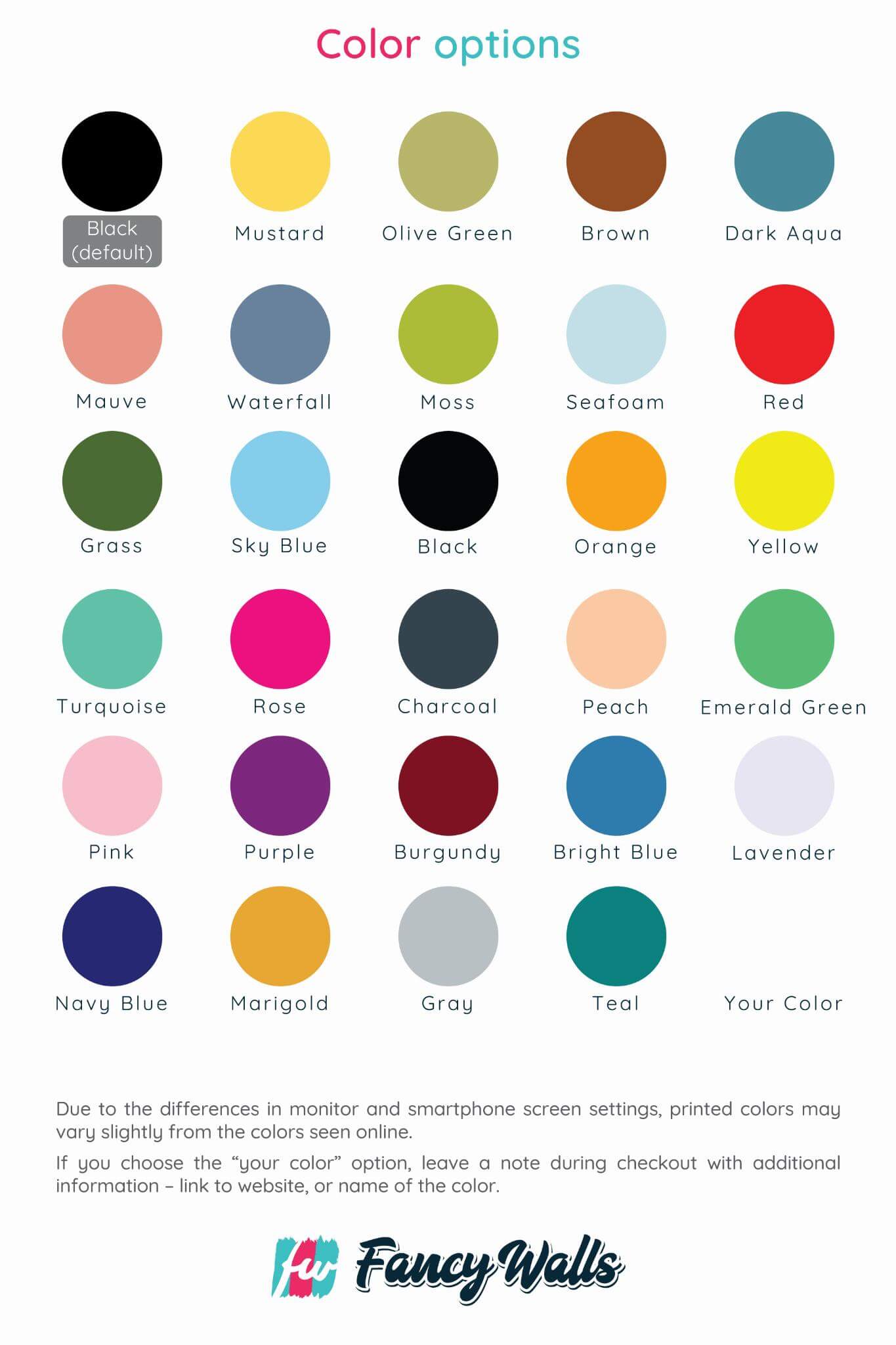 | Pattern color | Black, Bright Blue, Brown, Burgundy, Charcoal, Dark Aqua, Emerald Green, Grass, Gray, Lavender, Marigold, Mauve, Moss, Mustard, Navy Blue, Olive Green, Orange, Original Color (like in preview), Peach, Petal, Pink, Purple, Red, Rose, Seafoam, Sky Blue, Teal, Turquoise, Waterfall, Yellow |