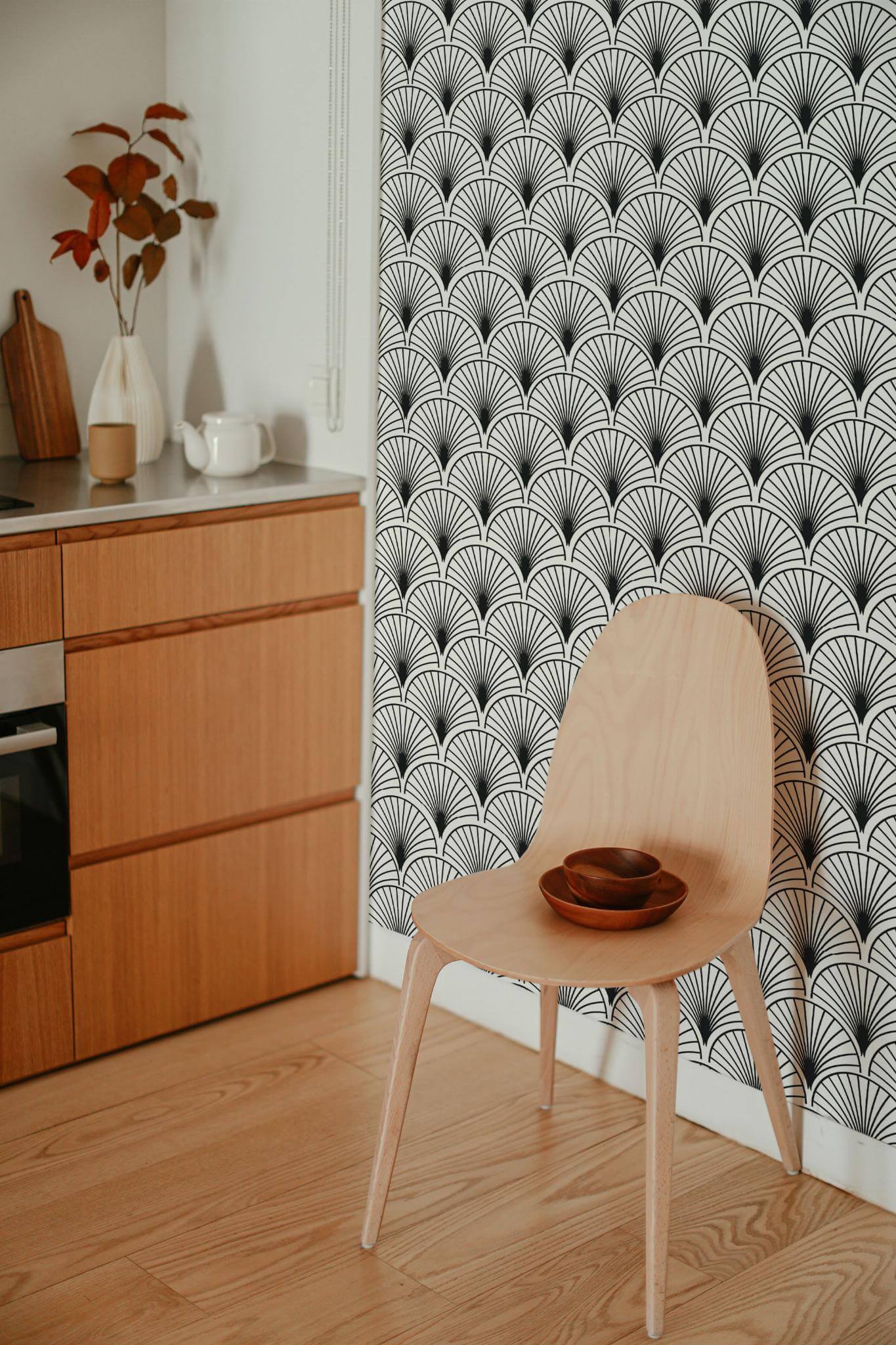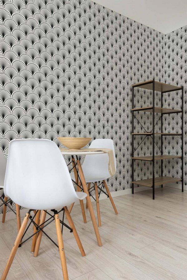 The Black and white Art Deco shell wallpaper introduces a sleek and bold Art Deco style to your home, perfect for an accent wall. Its striking black and white geometric fan pattern, with bold, symmetrical arches, radiates elegance and makes a timeless statement. While it’s recommended for accent walls, this luxurious design can enhance any space, offering a retro yet modern edge to your interiors. Available in both peel and stick (self-adhesive – no glue needed, removable) and traditional non-pasted options, the peel and stick version is particularly easy to apply, allowing you to effortlessly transform your space. The original Black and white can be replaced with any of our standard shades or a custom color of your choice, providing endless possibilities to match your unique style. Embrace the adventure of redecorating with this design, crafted by a passionate team committed to creating safe, PVC-free, and beautiful wall décor for every home.