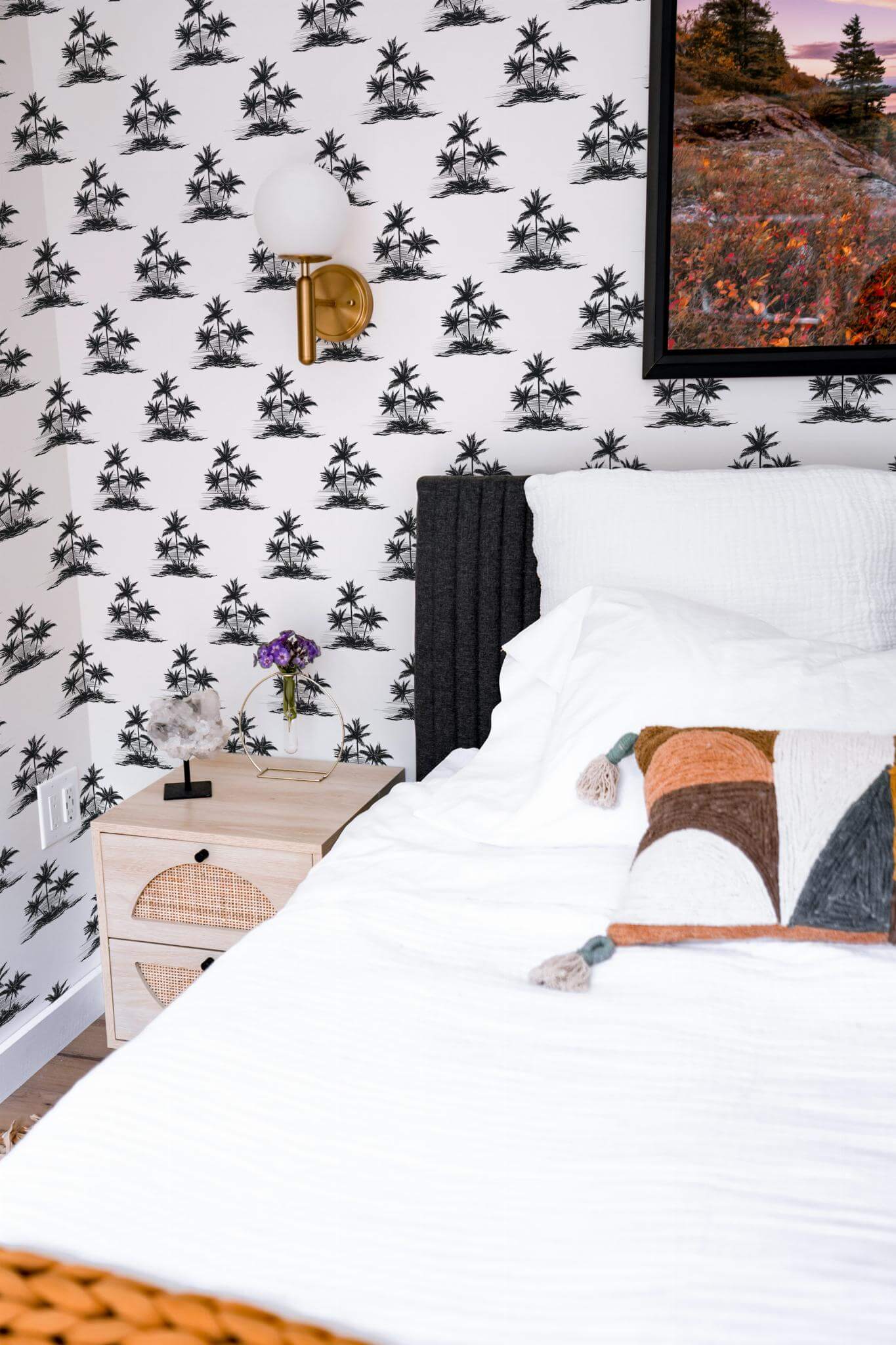 Transform your space with the Black and white palm trees wallpaper, an elegant tropical design featuring a striking black and white palette, perfect for adding a serene touch to your bathroom. This minimalist, linear layout of exotic palm trees on a crisp white background brings a beachy, relaxing vibe to any room, infusing it with an island-inspired charm. The Black and white palm trees wallpaper is available in two versatile options: the easy-to-apply peel and stick version, which is self-adhesive and removable, and the traditional non-pasted option that requires glue. For a personalized touch, the original Black and white can be replaced with any of our standard shades or a custom color of your choice. Our adventurous team is passionate about creating PVC-free, safe, and stunning wall décor that inspires joy and brings the beauty of nature into homes worldwide.