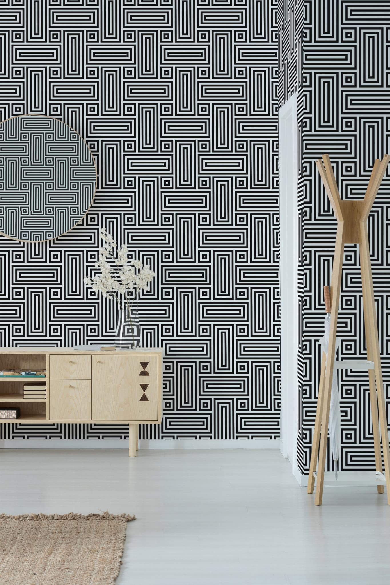 Black and white retro geometric wallpaper brings a modern and bold flair to your accent wall with its striking monochrome maze pattern. This intricate design, with its chic, retro vibe, is perfect for any room looking to make a statement, whether it’s a living room, bedroom, or office. The Black and white retro geometric wallpaper is available in both peel and stick, which is easy to apply and remove, and a traditional non-pasted option for those who prefer a classic approach. The original Black and white can be replaced with any of our standard shades or a custom color of your choice, allowing you to personalize your space with ease. Our team is dedicated to bringing joy and innovation to your home, offering safe, PVC-free wall décor that transforms your surroundings into a lively and stylish haven.