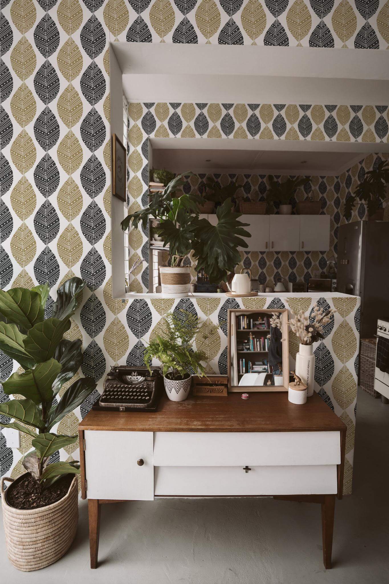 Boho leaf wallpaper brings a vibrant boho style to your hallway with its colorful leaf pattern, featuring bold black and beige motifs against a crisp white background. This chic design creates a striking modern contrast that can enhance not only hallways but also other spaces like living rooms or bedrooms, adding a touch of nature-inspired elegance. Boho leaf is available in two options: the easy-to-apply peel and stick version, which is self-adhesive and removable, and the traditional non-pasted version that requires glue for application. Embrace the geometric and minimalist charm of this monochrome wonder and transform your home into a lively, beautiful haven with our innovative, PVC-free wall décor.
