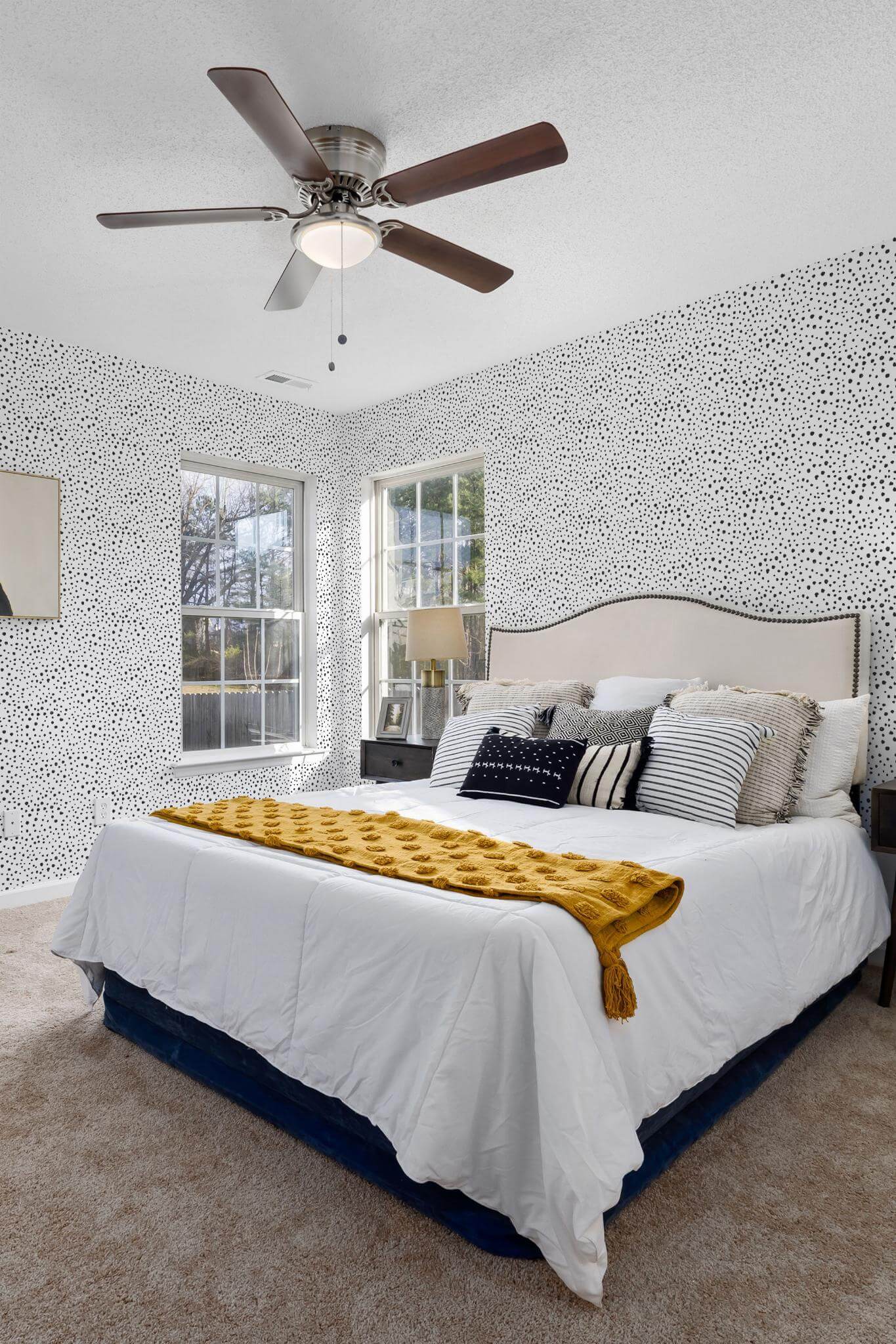 Dalmatian print wallpaper brings an eclectic flair to your bedroom with its playful black polka dots scattered across a crisp white canvas. This lively monochrome pattern offers a dynamic, modern touch that enhances not only bedrooms but also living rooms, home offices, or any space craving a splash of abstract charm. Available in both peel and stick and non-pasted options, the Dalmatian print wallpaper is versatile and accessible, with the peel and stick version making it easy to transform your room without the need for glue. Embrace the timeless appeal of black and white, or customize the colors to match your unique style by choosing from our standard shades or requesting a custom hue. Our passion lies in creating safe, PVC-free wall décor, inspiring homes worldwide with beauty drawn from nature’s own palette.