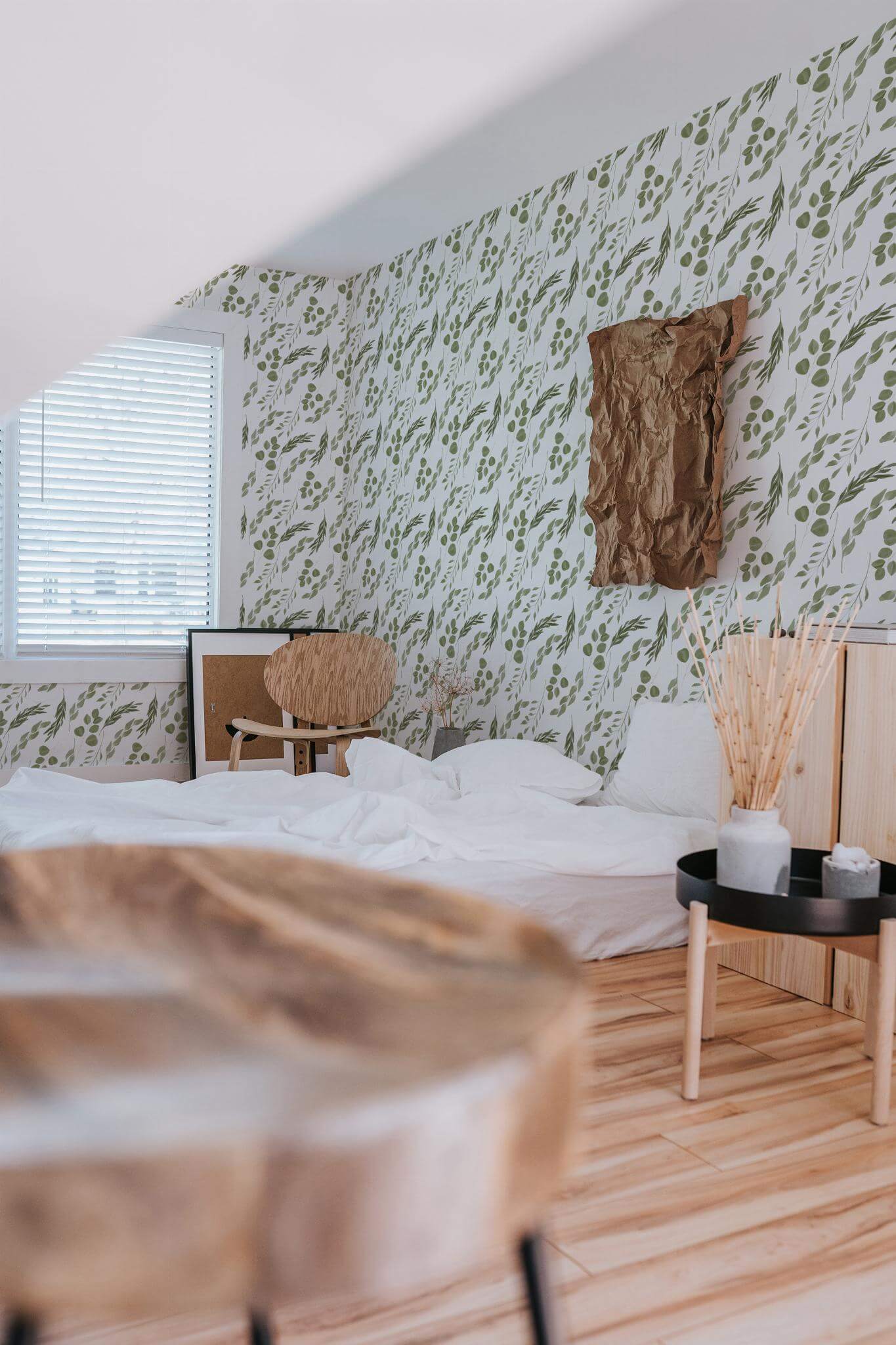 Eucalyptus wallpaper brings a serene botanical style to your bedroom with its delicate sage green leaf motifs scattered on a crisp white background. Designed to evoke a sense of tranquility and freshness, this pattern can transform any space into a calming retreat, from living rooms to home offices. The Eucalyptus wallpaper is available in two convenient options: the innovative peel and stick version, which is easy to apply without glue and can be removed without hassle, and the traditional non-pasted version for those who prefer a classic application. Embrace the peaceful allure of nature in your home with Eucalyptus, crafted by our passionate team dedicated to providing safe, PVC-free, and beautiful wall décor that infuses life and joy into every corner of your world.