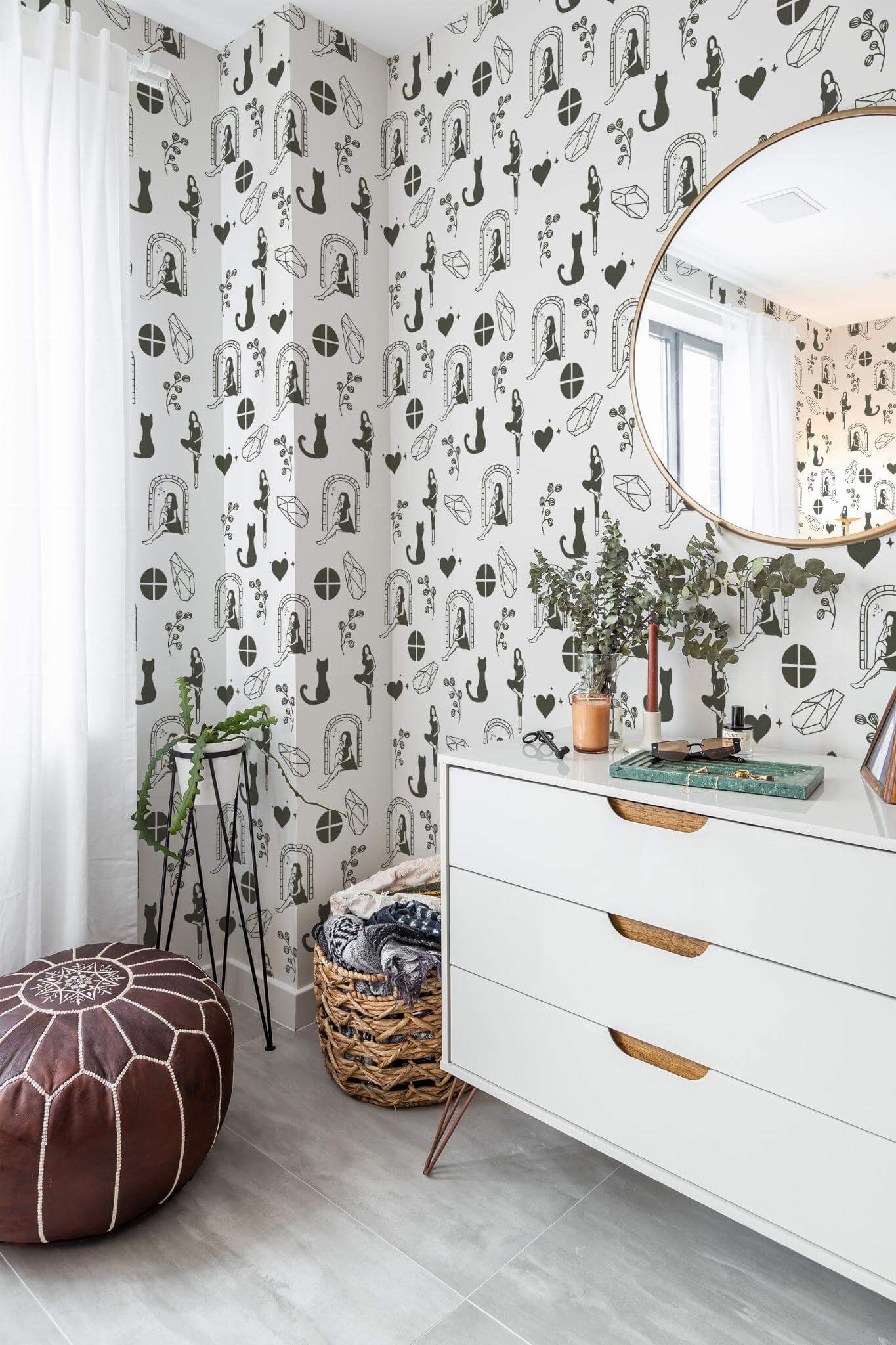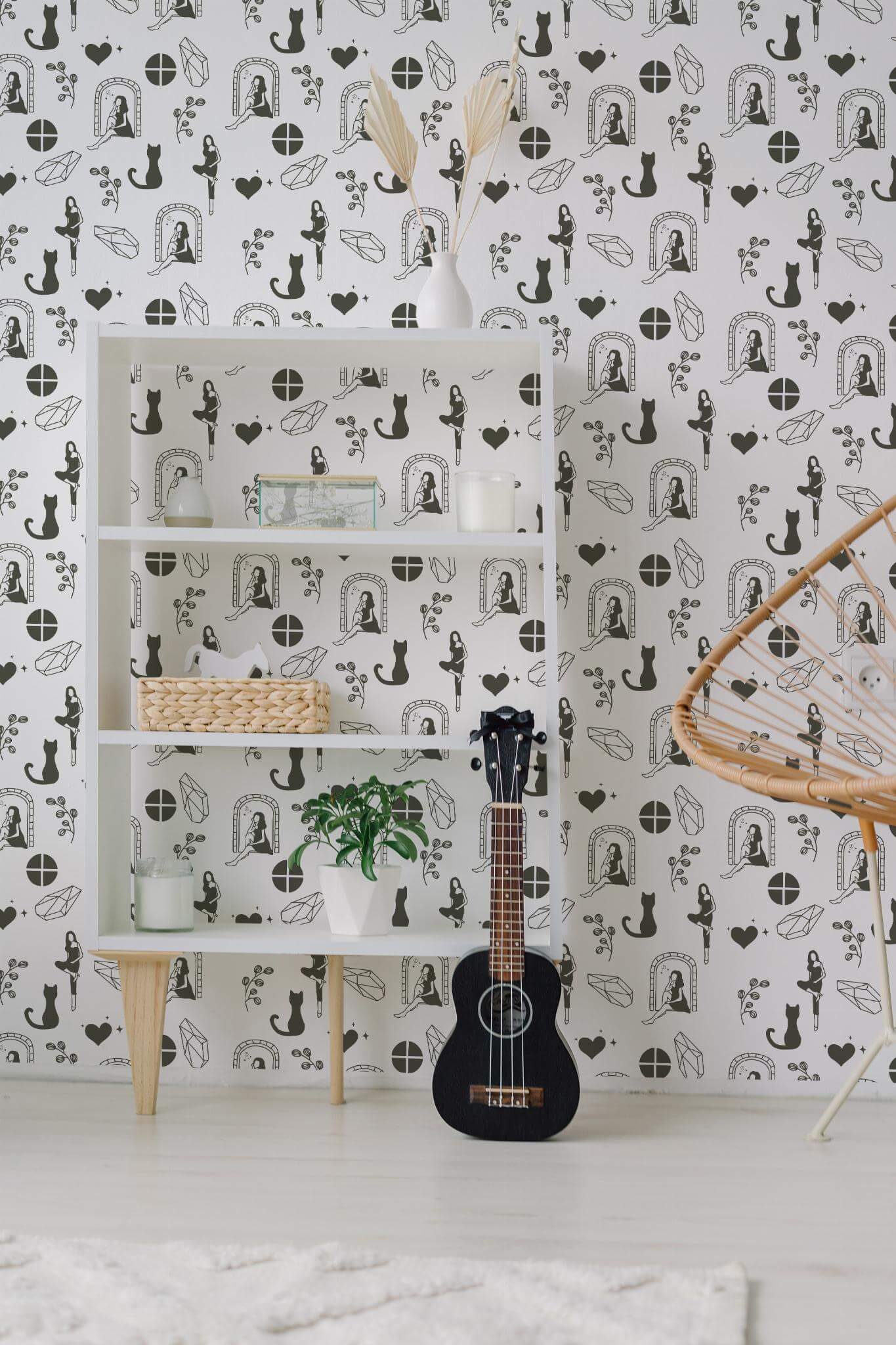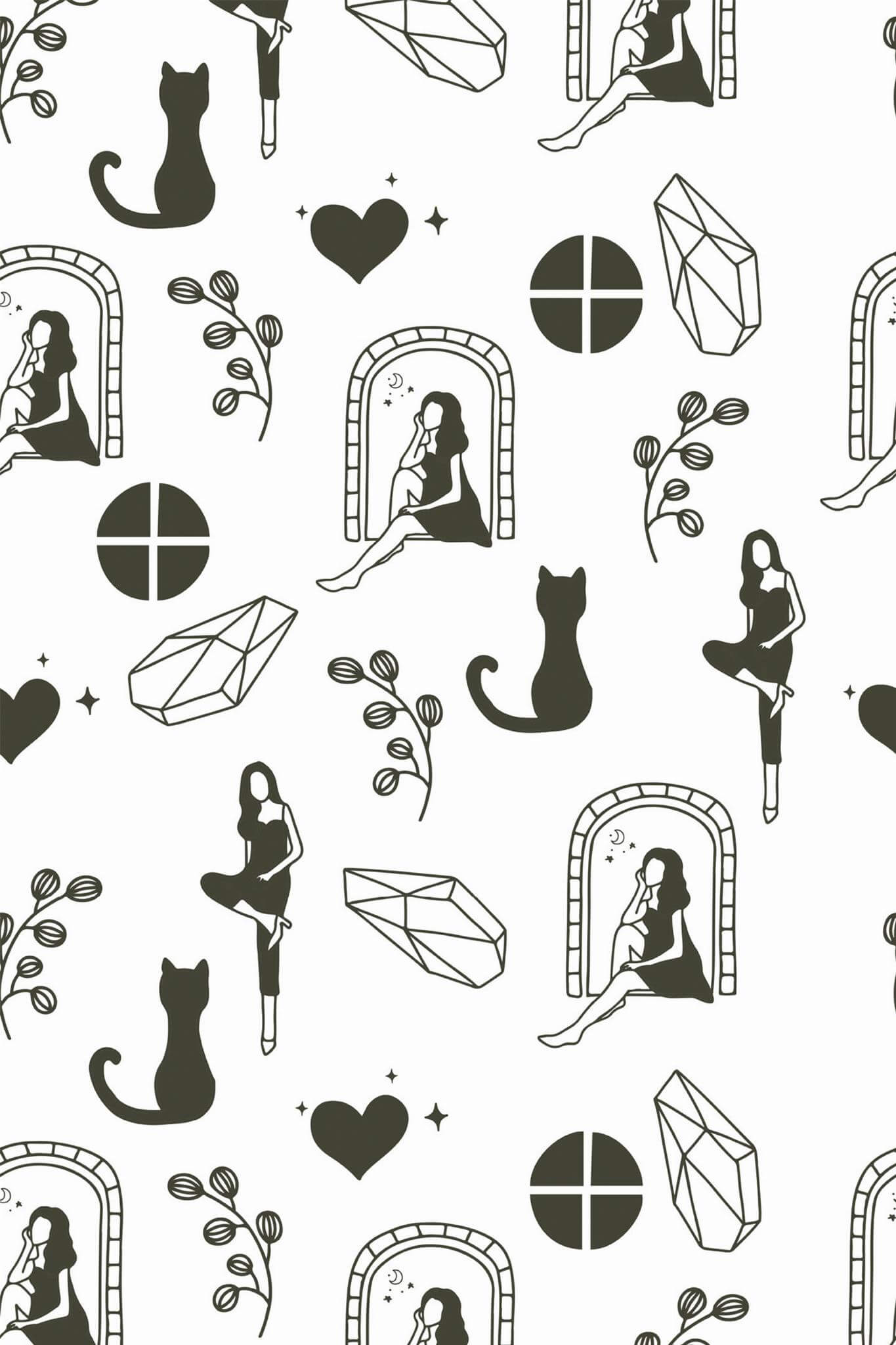 Girly wallpaper brings an eclectic style to life with its whimsical black and white pattern, perfect for transforming your powder room into a playful haven. This design, with its charming silhouettes of cats, seated figures, and geometric shapes intertwined with botanical elements, adds a touch of magic to any room, from cozy reading nooks to vibrant living areas. Available in both peel and stick (self-adhesive, no glue needed, removable) and traditional non-pasted (glue required) options, Girly wallpaper ensures a seamless fit for your creative vision. The original black and white can be replaced with any of our standard shades or a custom color of your choice, allowing you to tailor the look to your unique style. Let Girly inspire you with its heartwarming blend of nature and imagination, bringing joy and color to your home, crafted by a passionate team dedicated to safe, PVC-free décor.