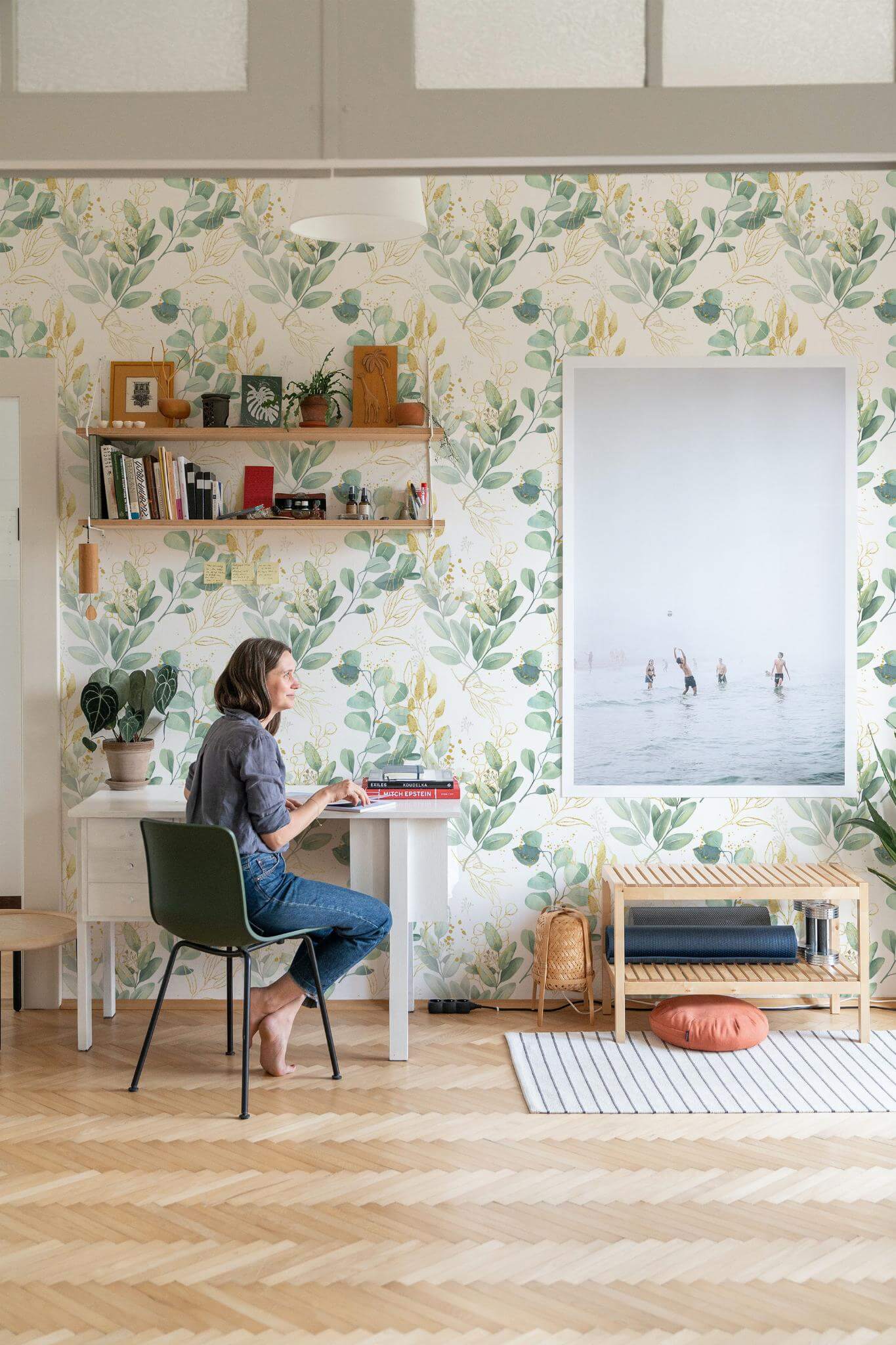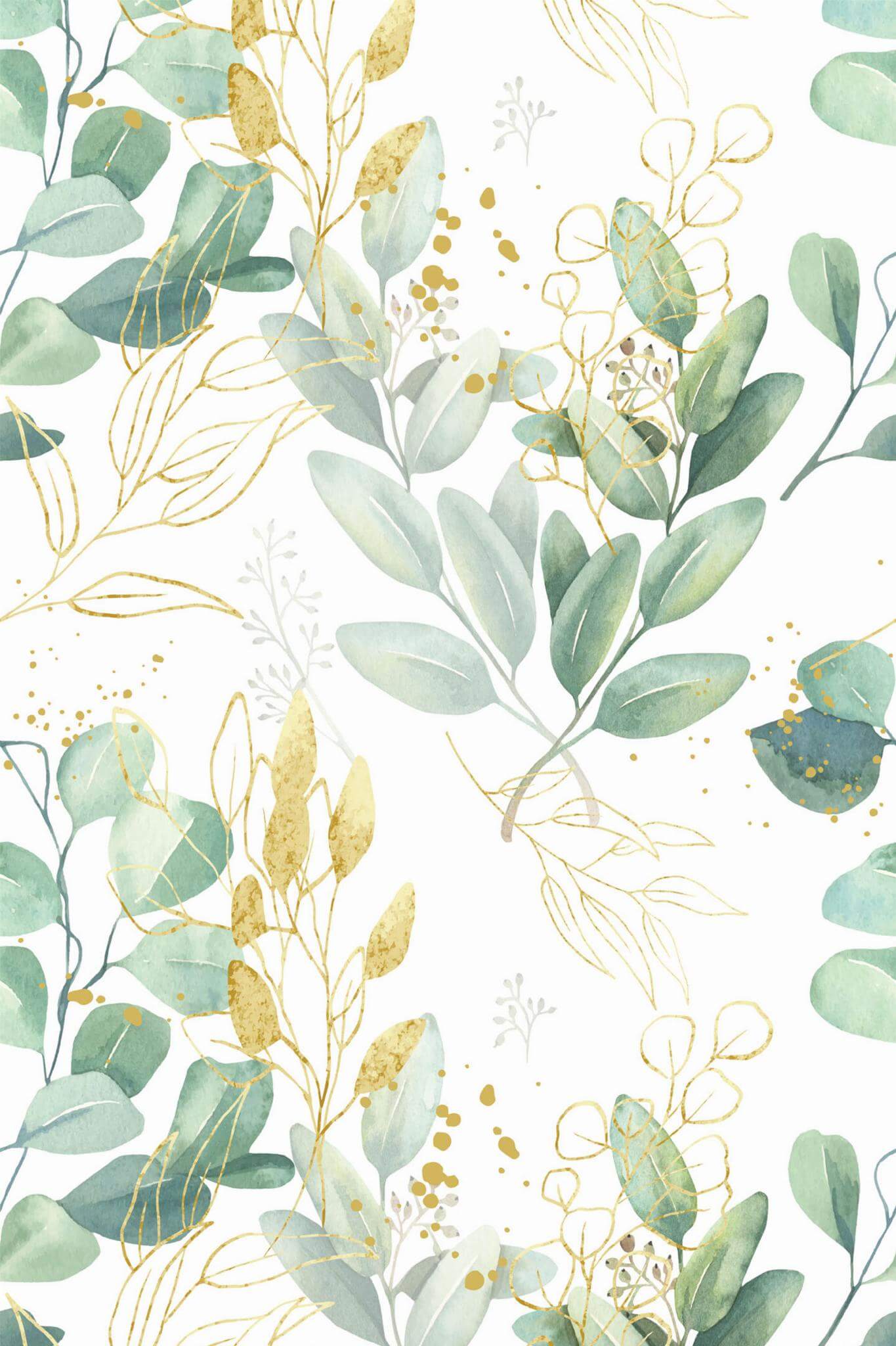 Transform your space into a serene sanctuary with the Green and white eucalyptus leaf wallpaper, featuring a botanical style that brings the tranquility of nature indoors. This delicate sage green leaf pattern with subtle golden imitation accents, set against a crisp white background, is perfect for creating a calming atmosphere in your spa. However, its elegant design can also enhance any room in your home, adding a fresh and natural vibe that feels both organic and sophisticated. The Green and white eucalyptus leaf wallpaper is available in two options: the easy-to-apply peel and stick version, which is self-adhesive and removable, and the traditional non-pasted version that requires glue. Embrace the beauty of nature with the Green and white eucalyptus leaf design and let it inspire a serene, tranquil environment wherever you choose to showcase it.