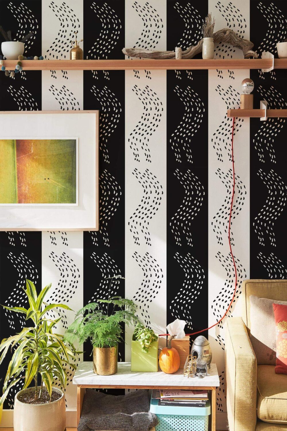 Horseshoe wallpaper brings a minimalist touch to your hallway with its black and white line art design, perfect for adding a playful yet sophisticated flair. This pattern, with its imaginative dashed loops and curves, creates a whimsical, rhythmic flow that transforms any space into a lively and inviting area. While ideal for hallways, the Horseshoe wallpaper can enhance any room, offering a fun and abstract charm that captivates and delights. Available in both peel and stick (self-adhesive – no glue needed, removable) and traditional non-pasted options, the peel and stick version is particularly easy to apply. The original black and white can be replaced with any of our standard shades or a custom color of your choice, allowing you to personalize your décor. Inspired by nature and crafted by our global team, Horseshoe is designed to bring color and joy to homes worldwide with its safe, PVC-free beauty.