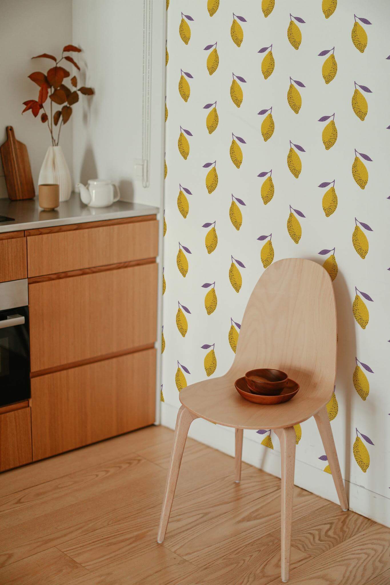 Lemon wallpaper infuses your kitchen with a fresh and playful botanical style, featuring cheerful yellow lemons and whimsical lavender leaves set against a crisp white backdrop. This bright and fruity design is perfect not only for kitchens but also adds a touch of whimsy and warmth to dining areas or sunrooms, transforming any space into a vibrant, inviting retreat. Offering both peel and stick and non-pasted options, Lemon wallpaper provides flexibility for your decorating needs. The peel and stick version is self-adhesive, making application a breeze with no glue required and easy removal whenever desired. Let Lemon bring a burst of sunshine and nature-inspired joy to your home with its delightful and innovative design.