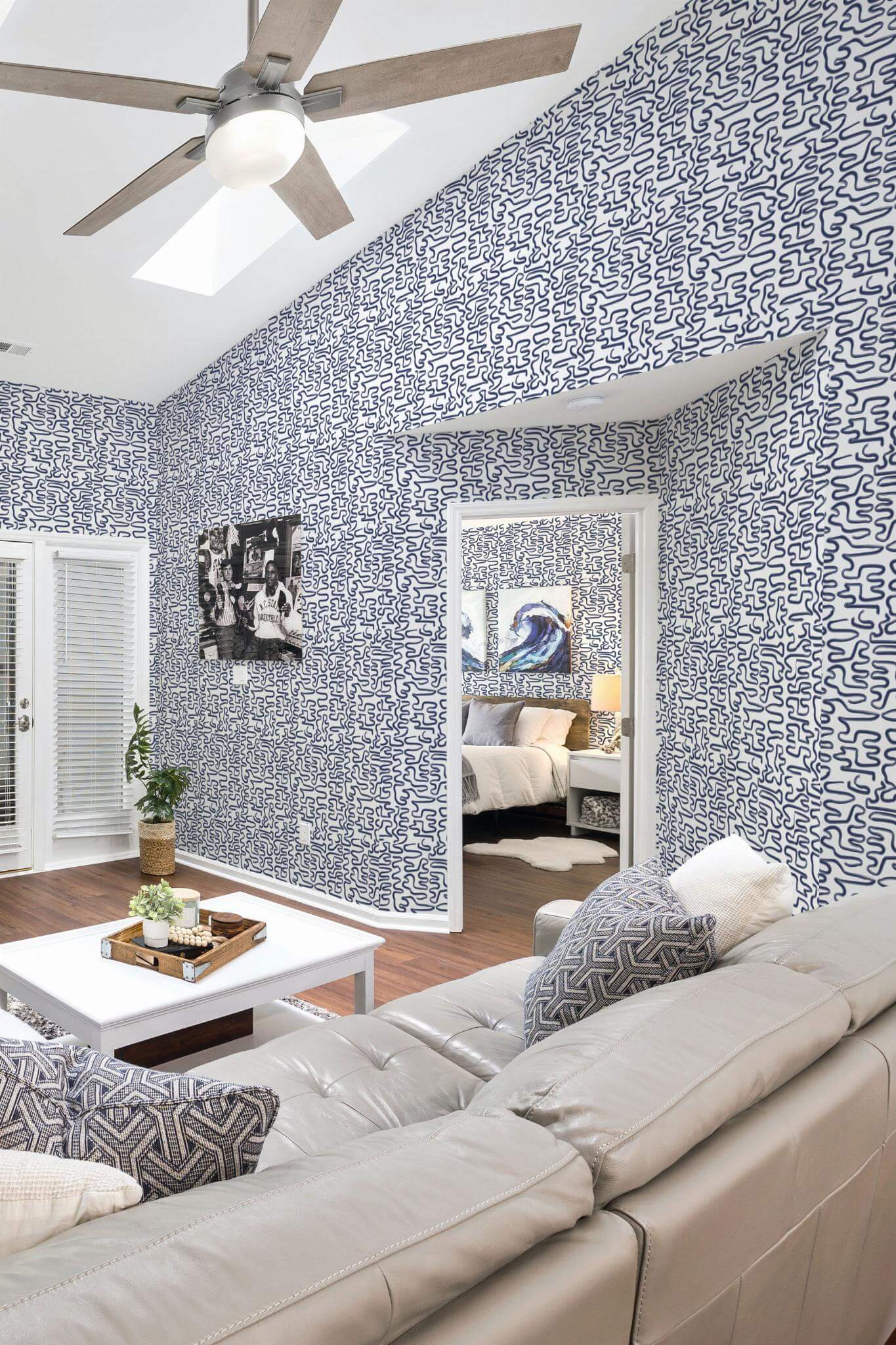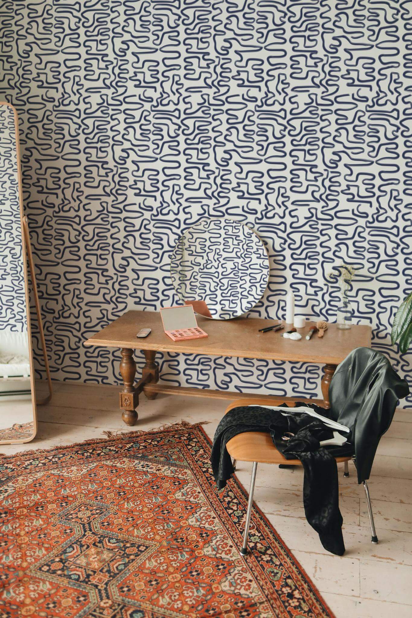 Maze line art wallpaper is an abstract masterpiece, featuring fluid navy blue brush strokes against a crisp white canvas, perfect for an accent wall. Its playful and dynamic pattern creates an energetic atmosphere, transforming any space into a modern haven. Whether you’re enhancing a living room, bedroom, or home office, the Maze line art wallpaper adds a maze-like artistic touch that captures the essence of flowing movement. Available in two options, the peel and stick version is easy to apply and remove, while the non-pasted option requires traditional glue application. Let the Maze line art inspire your interiors with its contemporary flair and vibrant energy, bringing a sense of innovation and joy to homes worldwide.
