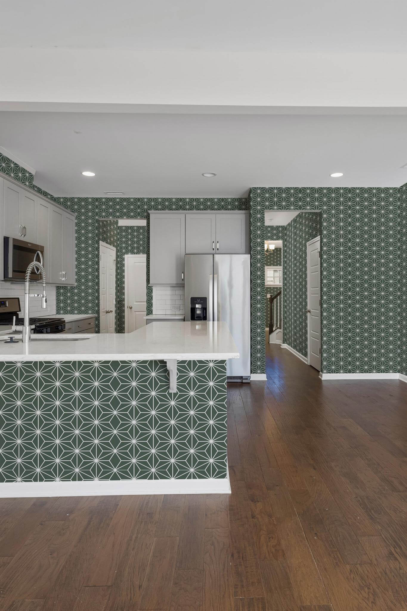 Modern geometric star wallpaper brings a stylish and contemporary touch to your kitchen with its bold geometric pattern. The intricate starburst design, in crisp white against a deep olive green backdrop, adds a dynamic and minimalist flair, enhancing not just kitchens but any space that craves a clean and structured look. Let your walls come alive with this vibrant pattern that speaks to the adventurer in you, inviting you to explore the joys of color and design. Available in both peel and stick, which is easy to apply and removable without hassle, and non-pasted options, this wallpaper adapts to your application preference. Plus, with the option to replace the original Green with any of our standard shades or a custom color of your choice, Modern geometric star wallpaper becomes a versatile backdrop for your creativity. Designed with a global perspective, our PVC-free wallpaper ensures a safe, beautiful home environment.