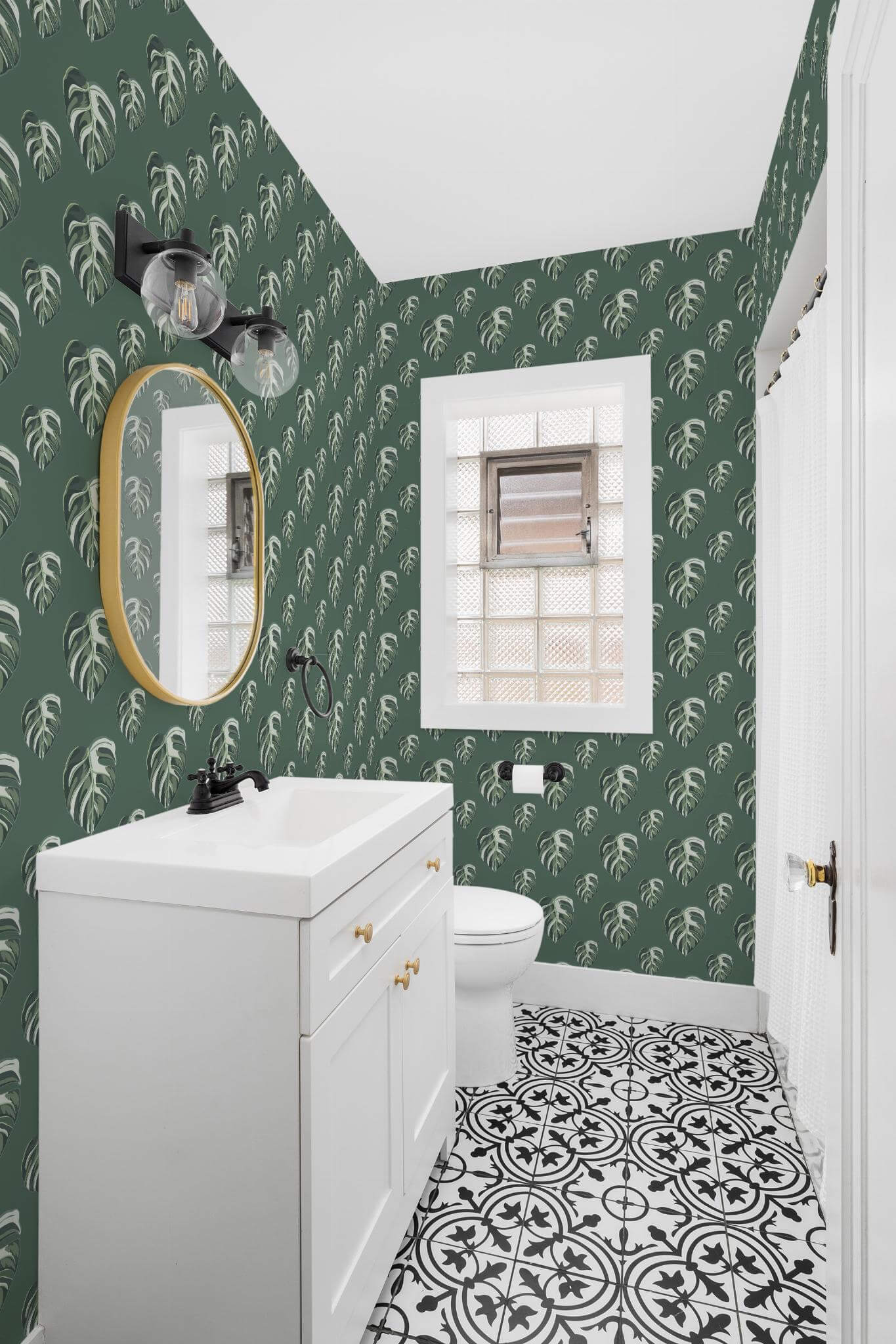 Monstera leaf wallpaper brings a tropical flair to your bathroom with its vibrant green hues and elegant leaf pattern, creating a fresh and serene atmosphere. This lush design, featuring monstera leaves scattered gracefully on an ivory-accented deep green backdrop, adds an exotic charm to any room, enhancing spaces with its bold and natural elegance. Whether you want to transform your bathroom or bring a touch of the tropics to your living area, Monstera leaf wallpaper is a perfect choice. Available in two options, the peel and stick version is easy to apply and remove, requiring no glue, while the non-pasted version offers a traditional application method. Embrace the adventure of infusing your home with the vibrant and innovative spirit of nature, as our team is passionate about providing beautiful, PVC-free wall décor that inspires joy and creativity worldwide.