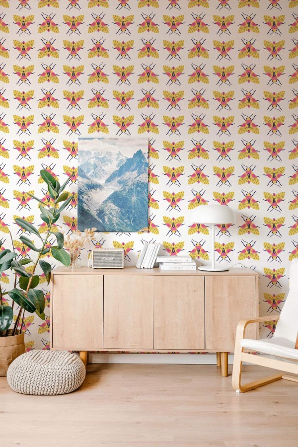 Multicolor bug wallpaper brings an eclectic burst of color and life to any space with its vibrant yellow and pink butterfly pattern, set playfully on a crisp white background. Perfect for an accent wall, this cheerful design enlivens rooms with its whimsical and joyful energy, making it a delightful addition to living rooms, bedrooms, or any area in need of a fun focal point. Multicolor bug wallpaper is available in two options: the peel and stick version, which is wonderfully easy to apply and remove without any glue, and the traditional non-pasted option, which requires glue for application. This design captures the adventurous spirit of nature and invites you to explore the vibrant possibilities of your home décor with a safe, PVC-free product. Experience the joy and innovation of transforming your space with the playful, repetitive charm of Multicolor bug.