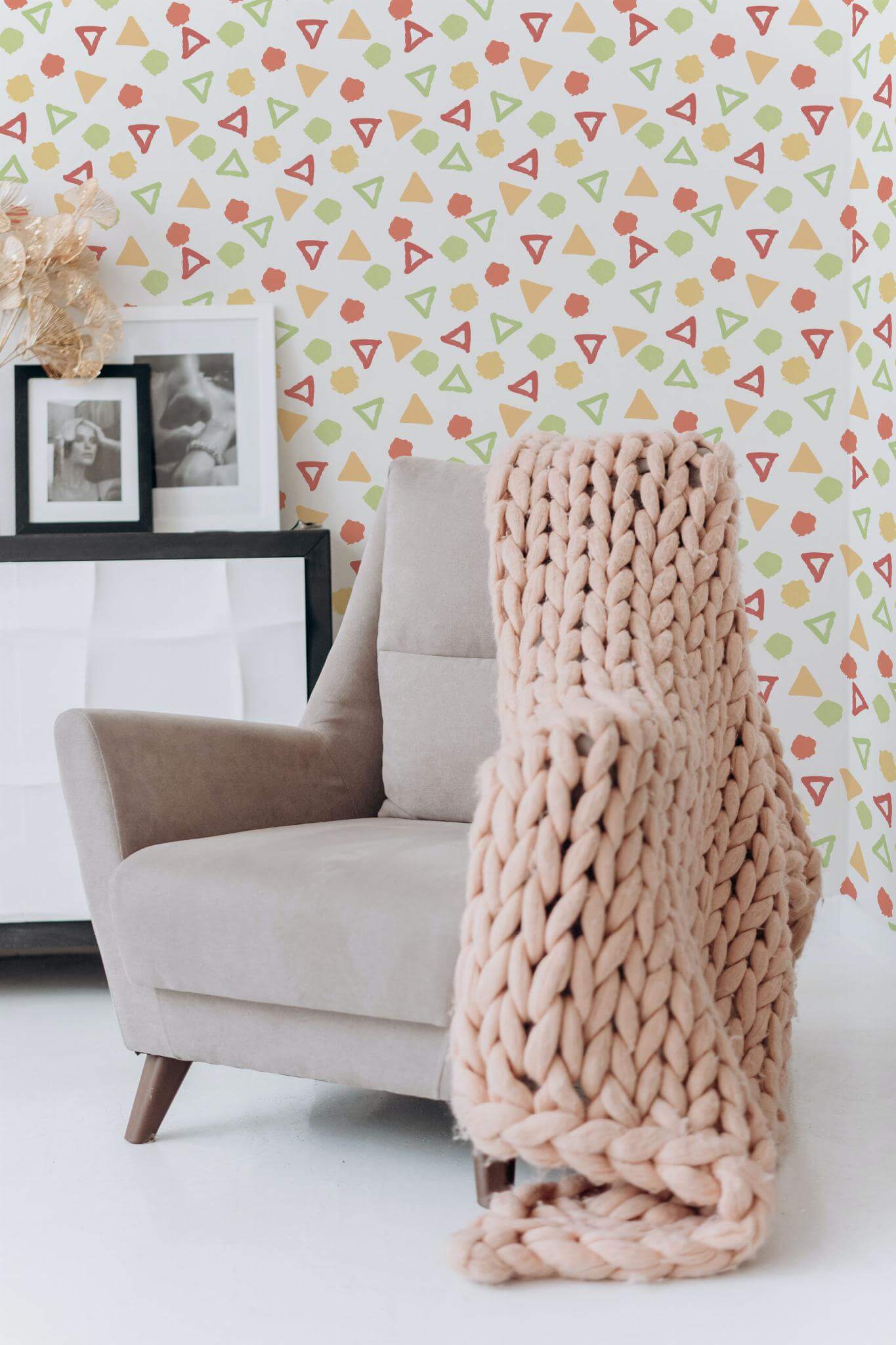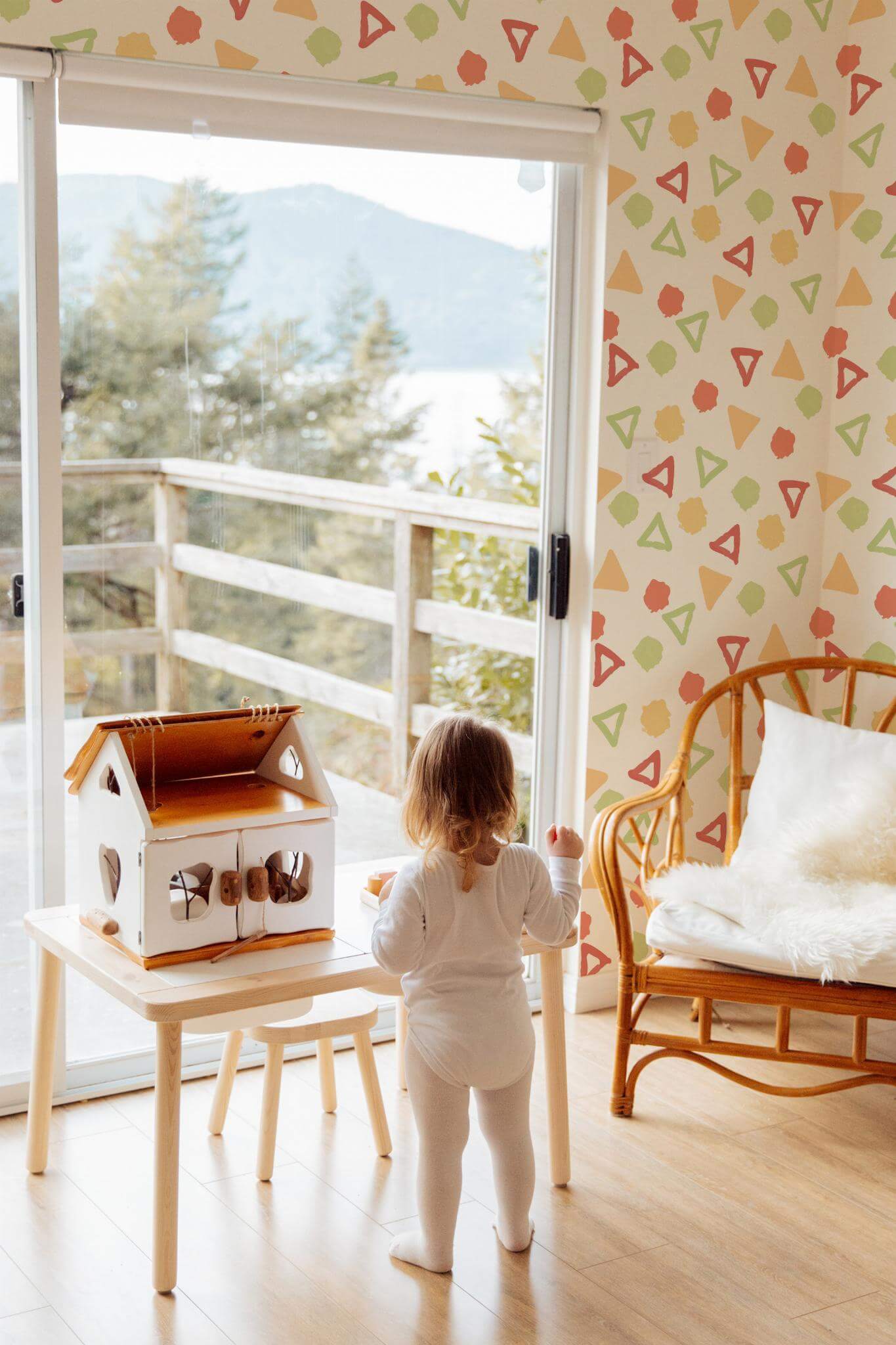 Multicolor geometric shapes wallpaper brings a funky and vibrant flair to any space, featuring playful pastel triangles and dynamic splashes of green, coral, and yellow on a crisp white background. Perfectly suited for a kids’ room, this cheerful design can also add a whimsical touch to playrooms or creative studios. Multicolor geometric shapes wallpaper transforms interiors with its artsy and abstract pattern, infusing them with a sense of joy and energy. This design is available in two options: peel and stick, which is self-adhesive, easy to apply, and removable; and traditional non-pasted, which requires glue for application. Let this enchanting design bring the magic of color and creativity to your home, reflecting our commitment to safe, PVC-free wall décor that inspires warmth and innovation in spaces worldwide.
