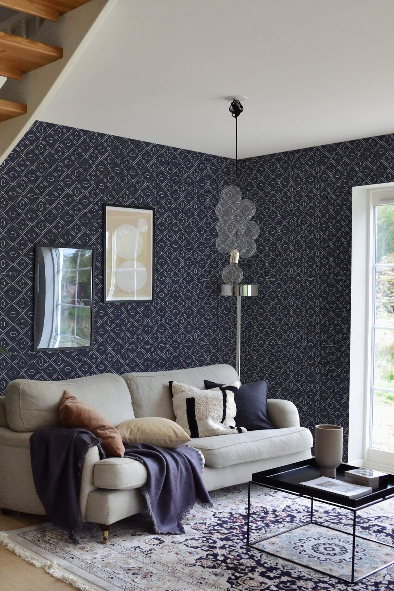 Navy Blue Geometric wallpaper brings a modern touch to any space with its elegant navy blue diamond pattern, enhanced by beige outlines and oval accents. Recommended for cafes, this sophisticated design adds a luxurious and chic atmosphere that’s both bold and glamorous. Perfect for more than just cafes, this wallpaper can transform living rooms, offices, or any area needing a stylish update. Available in peel and stick (self-adhesive, removable, and easy to apply) and non-pasted options, you can choose the application that best suits your needs. Bring the adventurous spirit of Navy Blue Geometric into your home and enjoy a space that radiates warmth and sophistication.