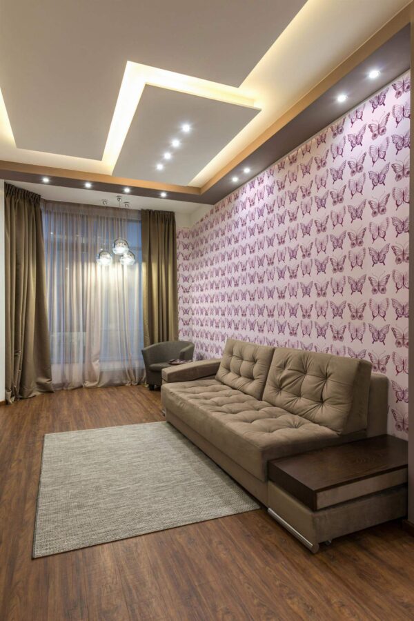 Pink butterfly wallpaper brings an eclectic flair to your living room with its whimsical design featuring delicate blush butterflies adorned with intricate burgundy detailing. The elegant and feminine pattern creates a charming atmosphere, making it a delightful addition to any space, from bedrooms to hallways. Pink butterfly wallpaper is available in two options: a peel and stick version that is easy to apply and remove without glue, and a traditional non-pasted version that requires glue for application. The playful yet sophisticated design of Pink butterfly invites nature’s beauty into your home, crafted with care by our passionate team committed to delivering innovative, PVC-free wall décor that transforms interiors with color and joy.