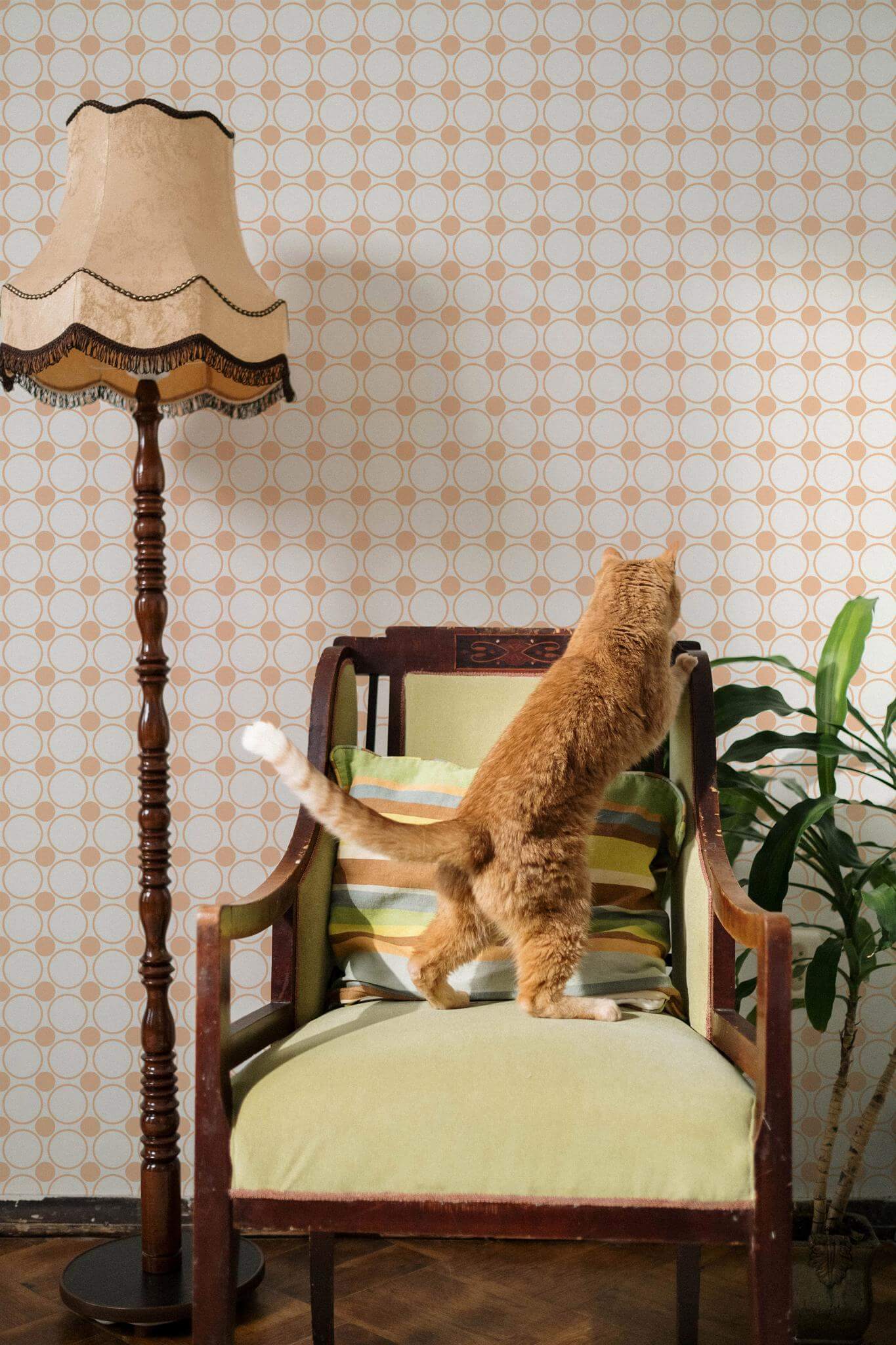 Retro geometric polka dot wallpaper, with its playful peach and white polka dot pattern, brings a cheerful and vintage vibe to your living room, or any room in your home. The geometric design, inspired by midcentury chic, creates a warm and inviting atmosphere, making it a perfect addition to spaces yearning for a touch of nostalgia. This delightful wallpaper is available in two options: a peel and stick version, which is self-adhesive and easy to apply without any glue, and a non-pasted version for a traditional application. Retro geometric polka dot wallpaper not only transforms interiors with its joyful charm but also allows for color customization—replace the original peach with any standard shade or a custom color of your choice. Join us in our mission to bring inspiration from nature into homes worldwide with our safe, PVC-free wall décor, designed to fill your space with life and color.