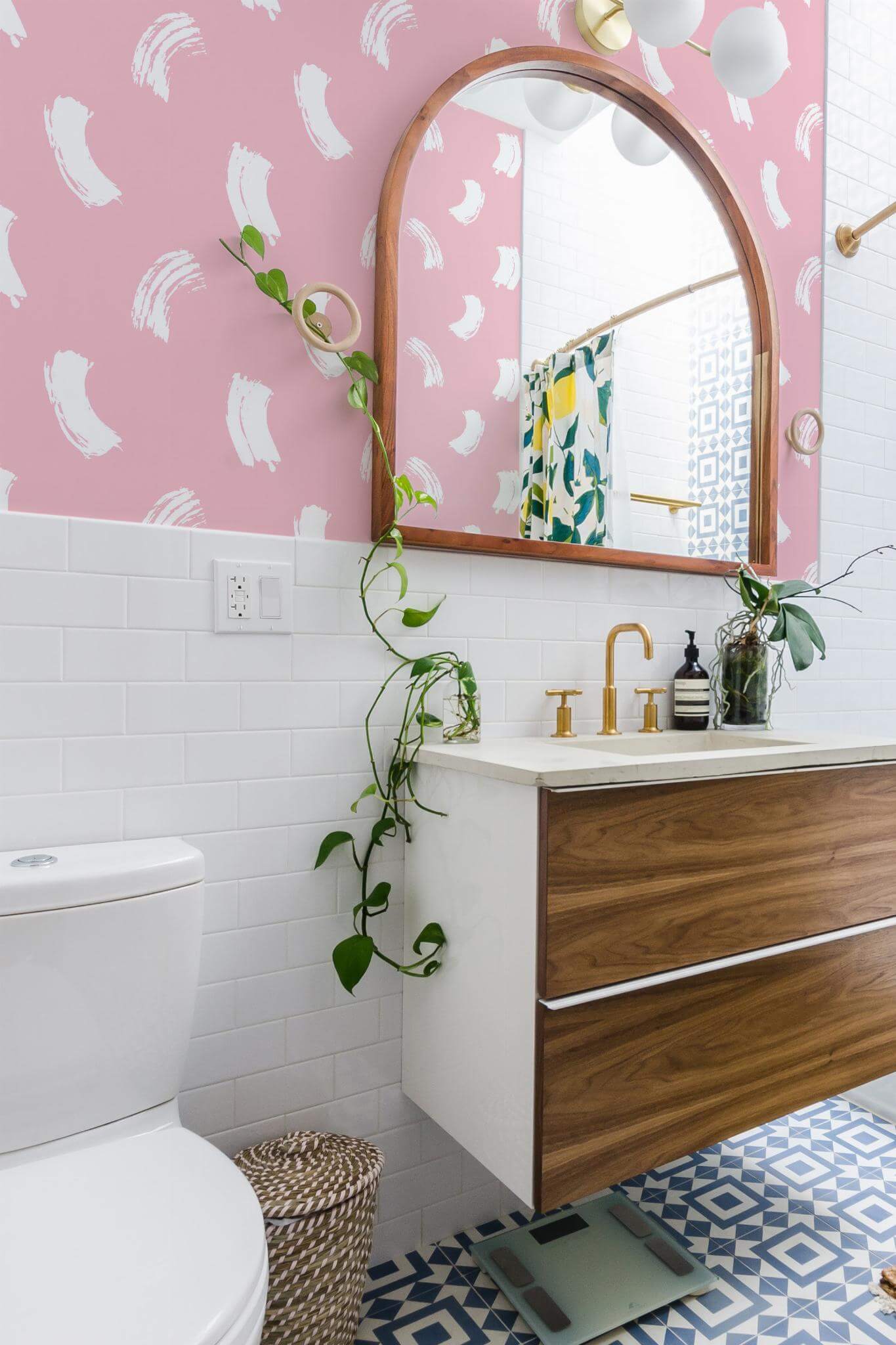 Seamless brush stroke wallpaper is an abstract delight that brings playful white brush strokes dancing across a gentle pink canvas, making it the perfect choice for a powder room. This whimsical design infuses any space with a joyful and soft ambiance, inspiring creativity and warmth. While it shines in a powder room, the Seamless brush stroke wallpaper can transform any room into an artistic haven, offering a fun and gentle touch to your interiors. Available in both peel and stick (self-adhesive – no glue needed, removable) and non-pasted options, the peel and stick version is especially easy to apply. The pink background can be replaced with any of our standard shades or a custom color of your choice, allowing you to tailor this design to your unique style. Our dedicated global team is passionate about crafting safe, PVC-free wall décor that brings vibrant life to homes everywhere.