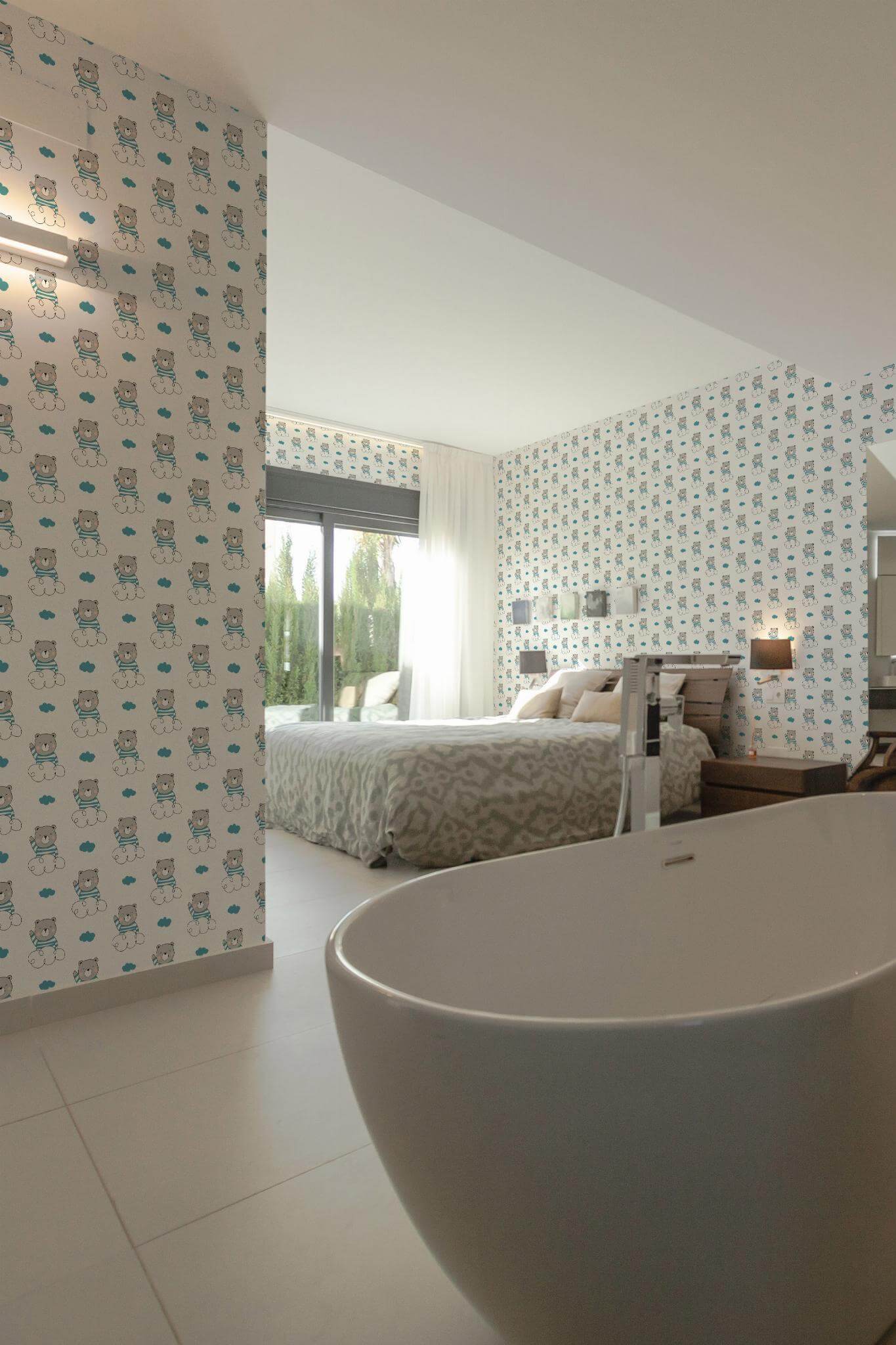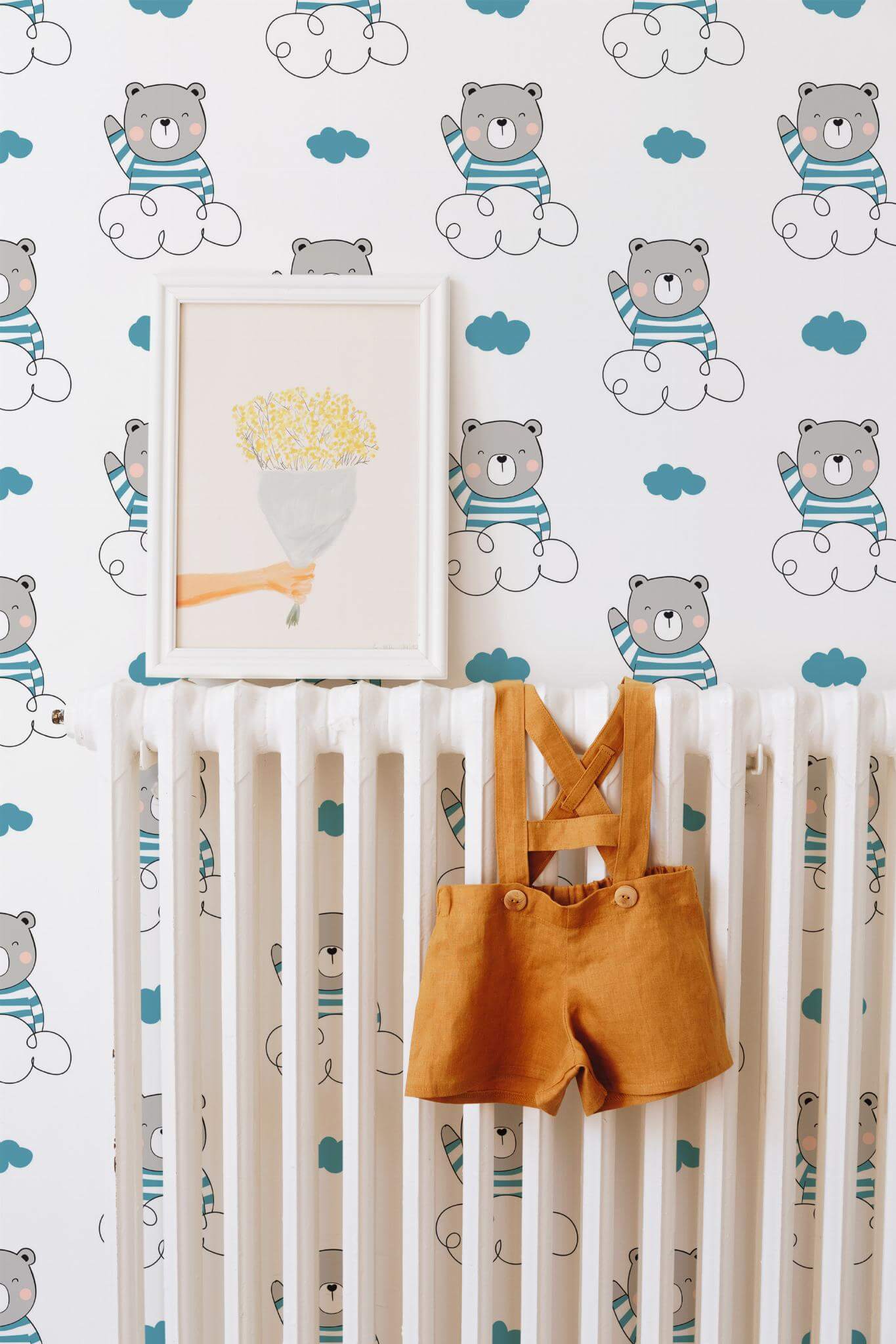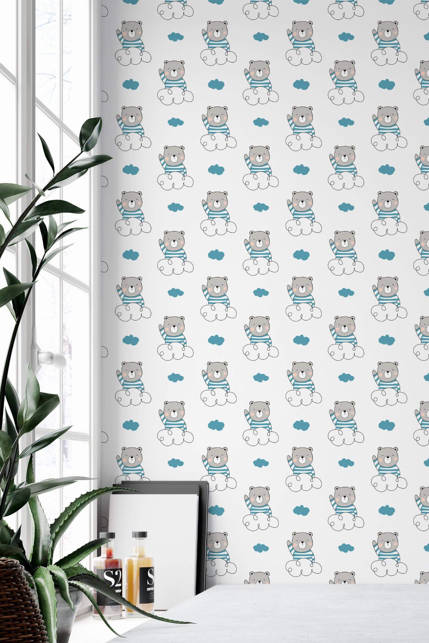Teddy bear wallpaper brings the cute Kawaii style to life with its delightful design featuring adorable gray bears in striped blue shirts floating on fluffy clouds, perfect for brightening up any kids room. The playful and whimsical pattern, set against a crisp white background, adds a touch of friendly charm that can enhance not only children’s spaces but also nurseries or playful corners in your home. Available in both peel and stick (self-adhesive – no glue needed, removable) and non-pasted options, the Teddy bear wallpaper makes it easy to create a dreamy, joyful atmosphere with its peel and stick version. Surround your little one’s world with an inspiring blend of cartoon joy and dreamy clouds, crafted by our passionate team dedicated to bringing innovative, PVC-free wall décor to homes everywhere. Let the Teddy bear design inspire a sense of adventure and warmth, transforming any room into a sanctuary of imaginative play.