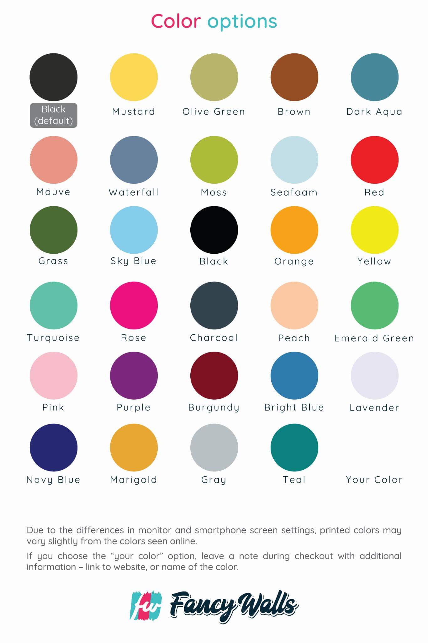 | Pattern color | Black, Bright Blue, Brown, Burgundy, Charcoal, Dark Aqua, Emerald Green, Grass, Gray, Lavender, Marigold, Mauve, Moss, Mustard, Navy Blue, Olive Green, Orange, Original Color (like in preview), Peach, Petal, Pink, Purple, Red, Rose, Seafoam, Sky Blue, Teal, Turquoise, Waterfall, Yellow |