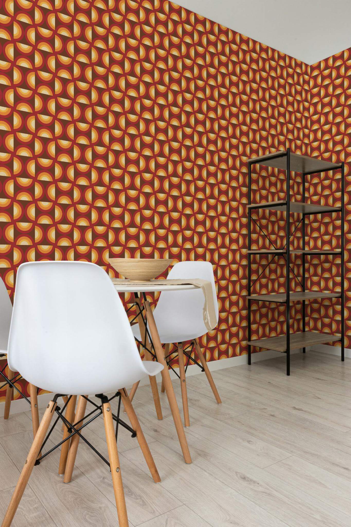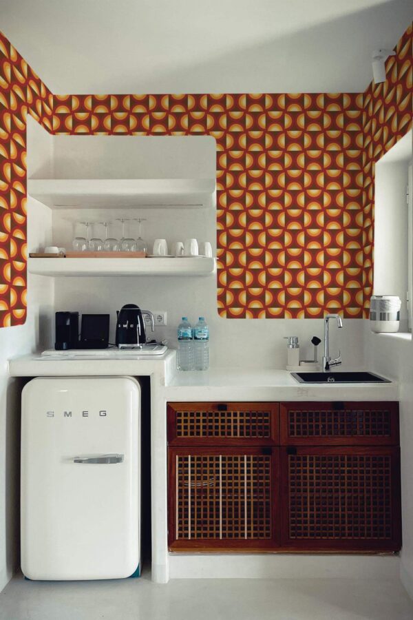 Vintage Retro wallpaper brings a touch of retro flair to your kitchen with its geometric pattern in warm brown and vibrant orange semicircles. This bold and rhythmic design not only enlivens kitchens but can also add a midcentury psychedelic charm to any room in your home. Transform your space effortlessly with the peel and stick option, which is self-adhesive and removable, perfect for those who love a quick and easy refresh. For those who prefer a traditional touch, the non-pasted option requires glue for application. With the Vintage Retro wallpaper, you can infuse any space with a warm, sunset-inspired ambiance, making every day feel vibrant and inviting.